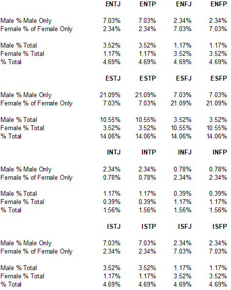 If you have been having a hard time finding someone like yourself, then the above table may help you see why you may have a problem. The rarest types for males are INFJ and INFP at 0.78% (slightly over ¾ of 1%) and for females, INTJ and INTP in like percentages. There is no one rarest type for either sex. (These numbers come from a article titled “The Genetics of Psychological Type” by Norbert Grygar available on Smashwords.com or Amazon.com)